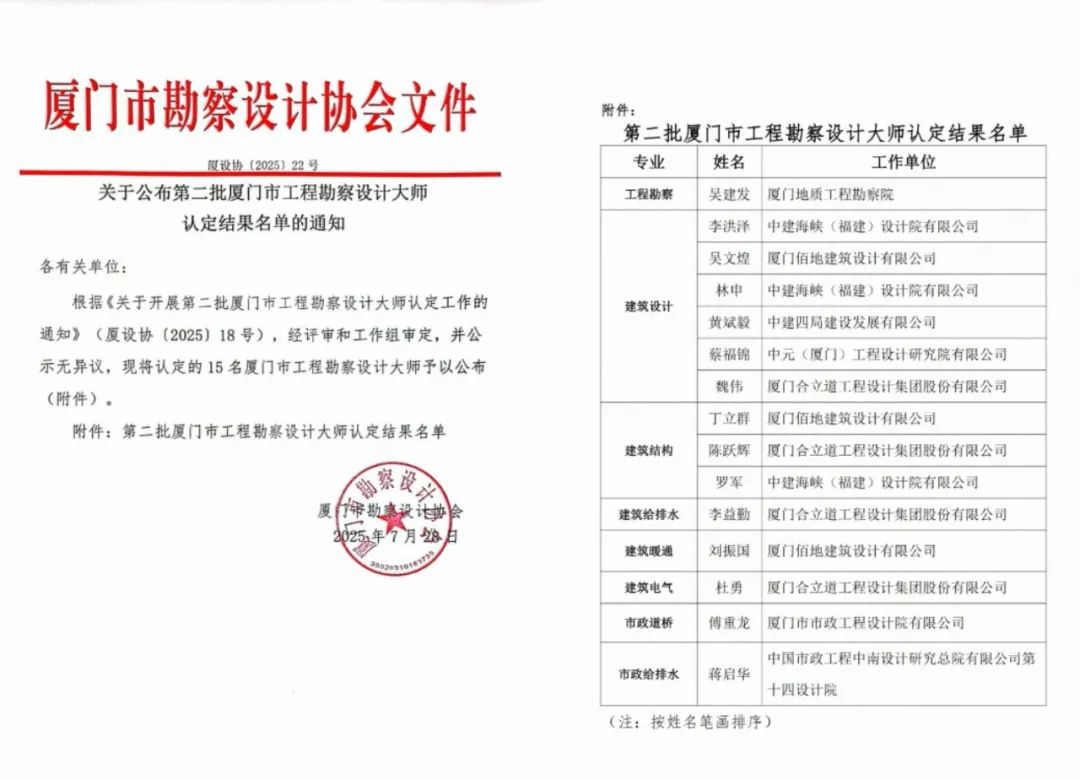 祝賀!中國(guó)中元專家榮獲“廈門市工程勘察設(shè)計(jì)大師”稱號(hào)